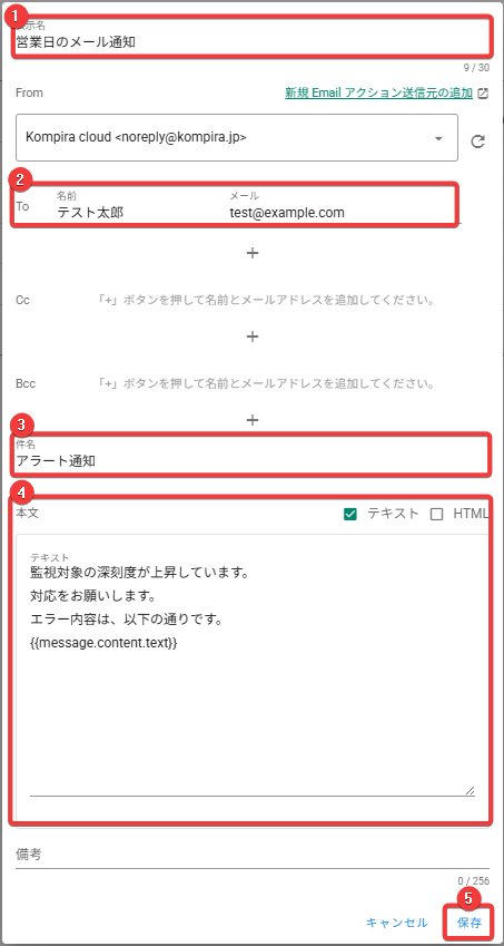 通知内容の設定については、Kompira AlertHub 基本マニュアル > 設定の流れ > アクションの作成 > 通知内容の設定 を参照してください。