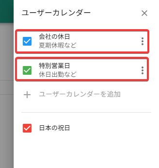 - 「+ ユーザーカレンダーを追加」ボタンをクリックします。