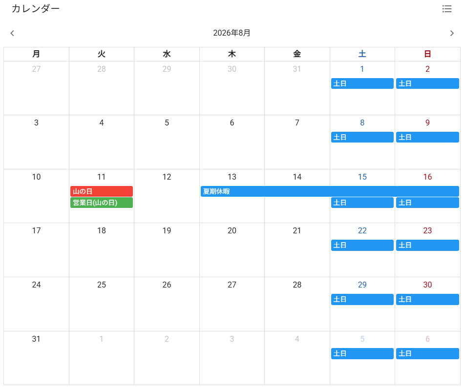 - カレンダー: 会社の休日