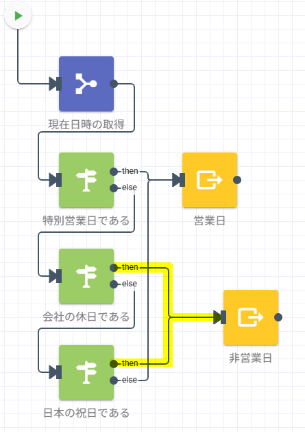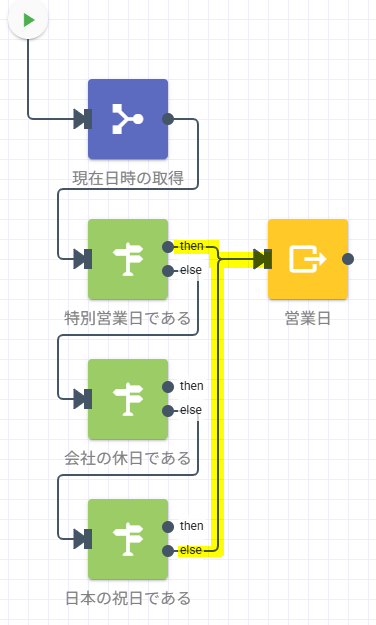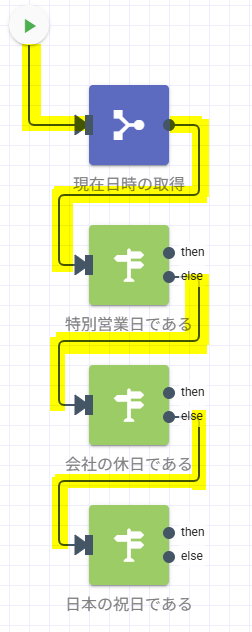 ここまでで追加された各ステップを以下の通りに並べ、黄色くハイライトされている通りに繋げます。
